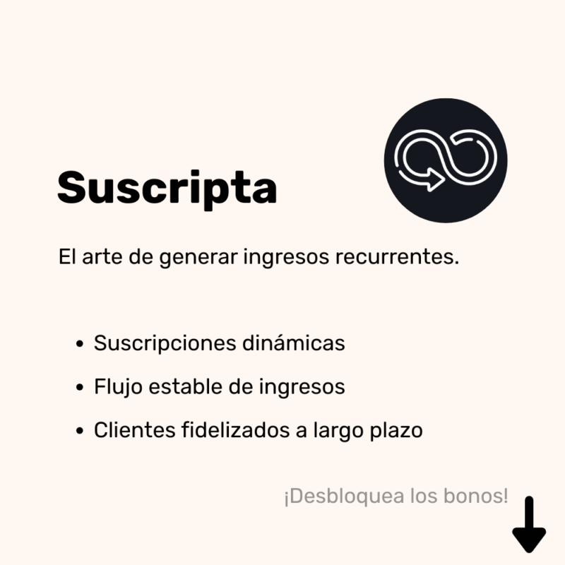 Suscripta – El sistema de suscripciones que genera ingresos constantes está diseñado para transformar la relación con tus clientes en un flujo estable y predecible de ingresos. Al ofrecer suscripciones personalizadas y adaptadas a cada necesidad, cada cliente siente que recibe un servicio pensado exclusivamente para él, lo que genera lealtad, confianza y satisfacción continua.